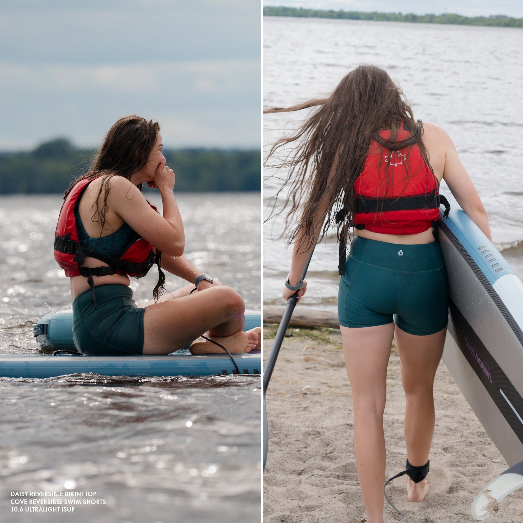 The Cove are reversible high-waisted swim shorts that offer more coverage than a traditional bikini bottom. Made from comfortably compressive Repreve Recycled material and featuring two side stash pockets, the Cove is perfect for beach sports and paddling of all types alike.