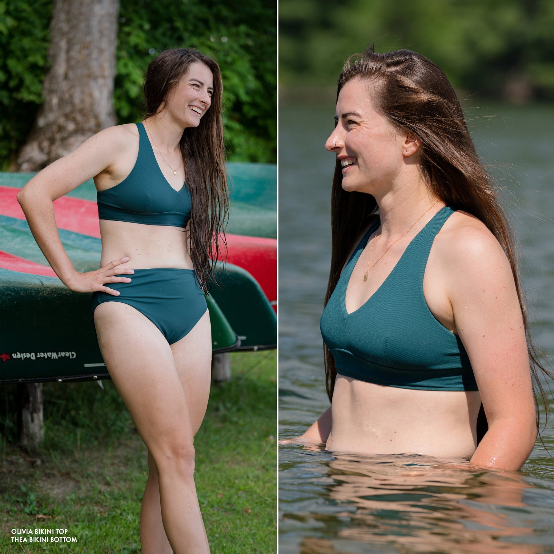 The Olivia is a medium-impact bikini top with a longline design featuring a sculpting under-bust panel. With adjustable shoulder straps and band, removeable bra cups, and a plunge neckline - the Olivia flatters while still prioritizing the supportive needs of an array of bust sizes.